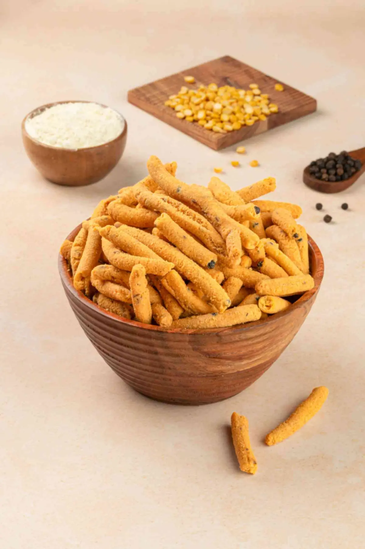 Milagu Sev is a crispy, deep-fried South Indian savory snack made from chickpea (besan) flour, oil, salt, and spices, notably flavored with fresh ground black pepper (milagu) for a warm, peppery kick